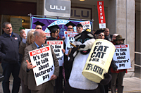 Lecturers from universities in London greeted a 'Fat Cat vice chancellor' outside the University of London Union on Tuesday 28 March, as employers' organisation UCEA met non-academic unions in the building. They excluded NATFHE and AUT, supposedly because of their continued non-strike action, yet UNISON's HE members were on strike over pensions!